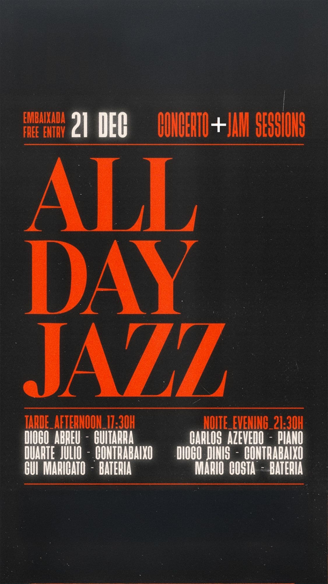 O All Day Jazz foi pensado para quem procura um bar com música ao vivo no centro do Porto, combinando talento musical e convívio numa experiência descontraída. O evento divide-se em dois momentos, um concerto às 17h30 e outro às 21h30. No concerto da tarde com Diogo Abreu na guitarra, Duarte Júlio no contrabaixo e Gui Maricato na bateria e, no concerto da noite, com Carlos Azevedo no piano, Diogo Dinis no contrabaixo e Mário Costa na bateria, a criar um ambiente vibrante e envolvente, típico dos melhores bares de jazz.