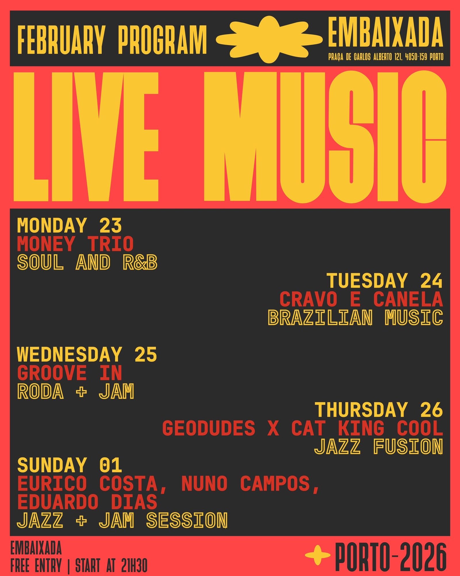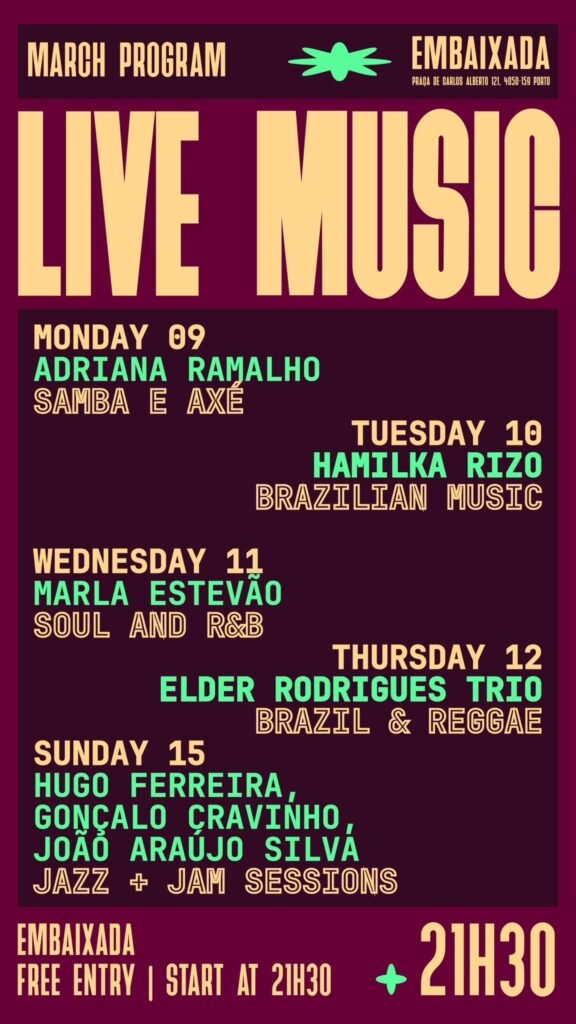 O Porto é conhecido pela sua oferta cultural rica e diversificada. Para quem procura um bar no Porto com concertos ao vivo, o Embaixada Bar oferece uma programação regular que inclui: Soul e R&B, Música Brasileira, Jazz, Groove e Jam Sessions. É o local ideal para quem gosta de descobrir novos talentos e apreciar diferentes estilos musicais num ambiente descontraído e artístico.