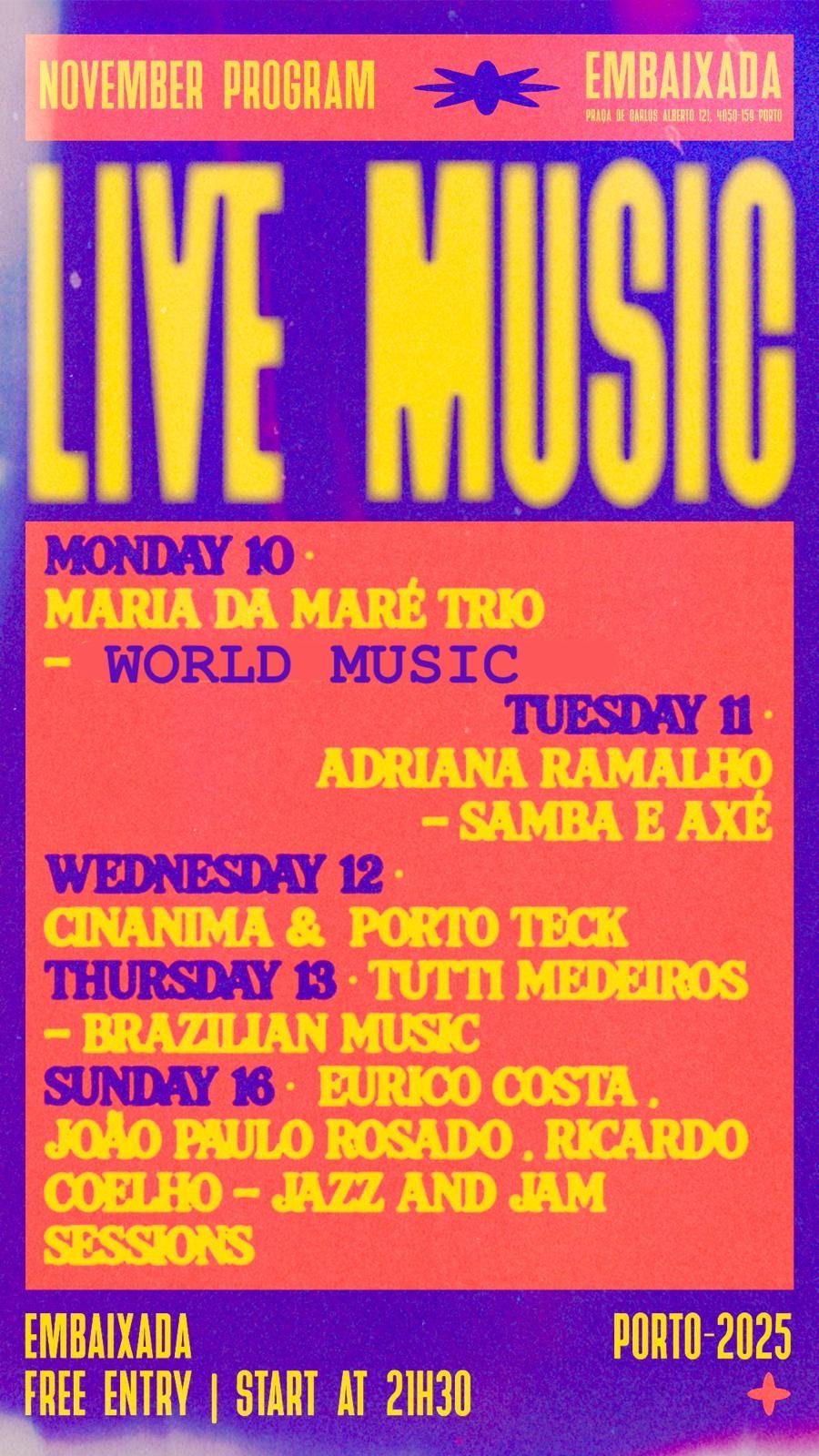 O palco recebe artistas locais e internacionais, com concertos ao vivo vibrantes. Hoje à noite a voz doce e poderosa da Tutti Medeiros traz ao palco o melhor da música popular brasileira, misturando ritmos modernos com clássicos inesquecíveis. Domingo é dia de jazz e jam sessions. Três grandes músicos portuenses, Eurico Costa, João Paulo Rosado e Ricardo Coelho, reúnem-se para uma noite improvisada de puro talento e groove. São noites cheias de energia, ritmo e estilo, com cocktails em happy hour todos os dias da semana.