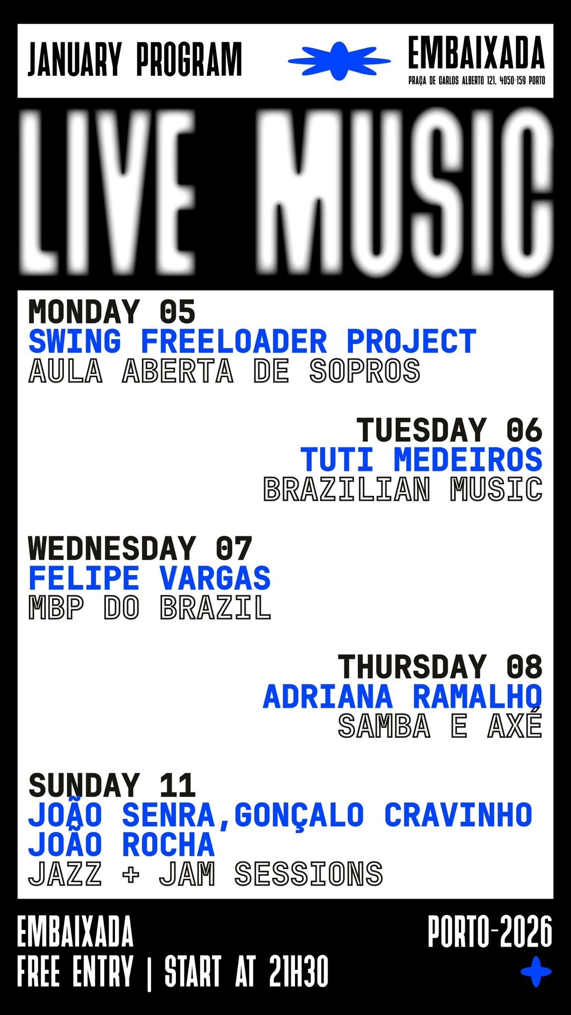 O ano começa em grande no Bar Embaixada com uma programação imperdível de música ao vivo, artistas nacionais e internacionais, entrada gratuita e um ambiente descontraído, intimista e acolhedor, perfeito para as noites mais frias de Inverno. Se gostas de boa música, cocktails criativos, petiscos deliciosos e momentos memoráveis é o local ideal para começar 2026.