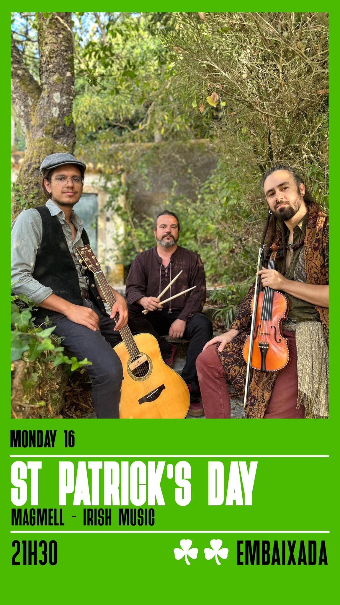 Uma das noites mais especiais do mês acontece hoje na celebração do St. Patrick’s Day, uma festa tradicional irlandesa celebrada em todo o mundo. Para marcar a ocasião, o palco do Embaixada Bar recebe o trio Magmell, que traz ao Porto um concerto dedicado à música tradicional irlandesa. Com instrumentos acústicos, violino e guitarra, o grupo recria o ambiente típico dos pubs da Irlanda, com melodias celtas cheias de energia e emoção.
